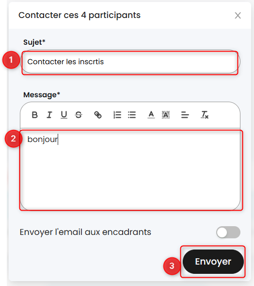 Faites de même, si vous voulez contacter seulement les participants avec le statut : En attente / Annulée | Payé / Payé partiellement / À payer