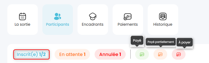 Statut du participant (Inscrit / En attente / Annulé | Payé / Payé partiellement / À payer)