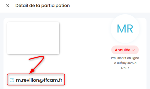 4. Cliquez sur le participant que vous souhaitez contacter, un onglet avec le détail de la participation apparaîtra à gauche de l'écran. Cliquez sur le mail de la personne comme suit :